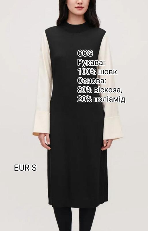 Платье COS из смесового шелка, прямого кроя, грациозно спадает до колена, обеспечивая комфорт и изысканность. Выполнена из фактурного тонкого трикотажа, имеет широкие рукава с манжетами из контрастного шелка тутового дерева. Платье в черно-белой (с кремовым оттенком) цветовой гамме, что делает его идеальным выбором для любого случая. Одевается без застежек, слегка расширяется к низу, имеет приподнятый воротник-стойку, что придает платью завершенный изысканный вид. Идеальное состояние.🔹Размер S. Нижняя бирка с составом отсутствует, в интернете нашла аналогичное платье, где указано составляющие (на остан. фото): 🌿Рукава: 100% шелк. 🌿Основа: 80% вискоза, 20% полиамид 🔹Пог - 45 см тягн. до 52 см🔹Длина - 109 см🔹Рукав - 65 см, от горловины 73,5 см🔹Плечи - 36 см, тянутся по шву до 42 см🔹Высота воротника-стойки - 5,5 см 👉Цена на такое платье на ebay около 3930 грн 👉🔹Отправлю платье после оплаты на карту Приват Новой почтой или Укр-почтой за счет покупателя. 🔹🔹Для примерки (по послеплате) отправляю по Новой почте после предоплаты 150 грн., Укрпочтой по послеплате не отправляю.