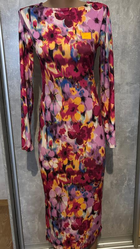 сукня міді з барвистим квітковим принтом та довгими рукавами. Вона має облягаючий силует та виготовлена з текстурованої тканини в рубчик