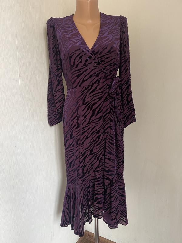 Платье-халат Calvin Klein, украшенное фактурным принтом «зебра» в тон ткани, дополнено струящимся поясом на талии и воланами. V-образный вырез; силуэт "футляр". Скрытая застежка-молния по центру спины. Пояс на талии сбоку; оборки по бокам юбки и по низу. На подкладке. Размер указан 6