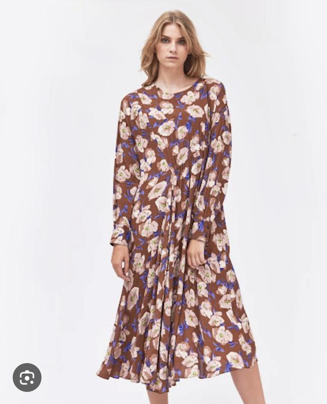 Красивое платье миди линейки Sportmax code от бренда Max Mara, коричневого цвета в цветочный принт, интересное исполнение в талии - резинка с одной стороны, легкая ткань, не просвечивает, размер М L, состояние новой вещи, только повреждена надпись на верхней бирке ПГ - 55 см, ПТ - 47 см, ПБ - 74 см, ШП - 57 см, длина рукава - 56 см, длина - 126 см