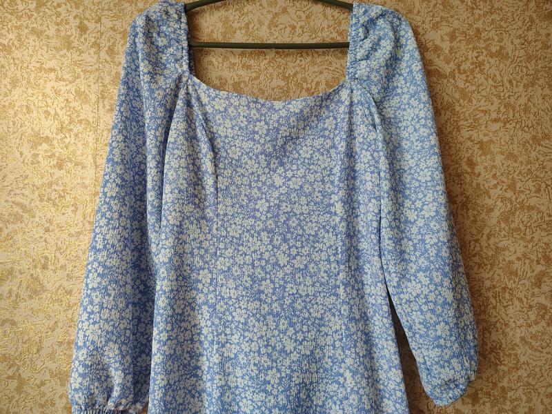 Платье голубого цвета летнего, меди, цветочный принт. Имеет разрез по ноге, рукава на резинке. Размер М