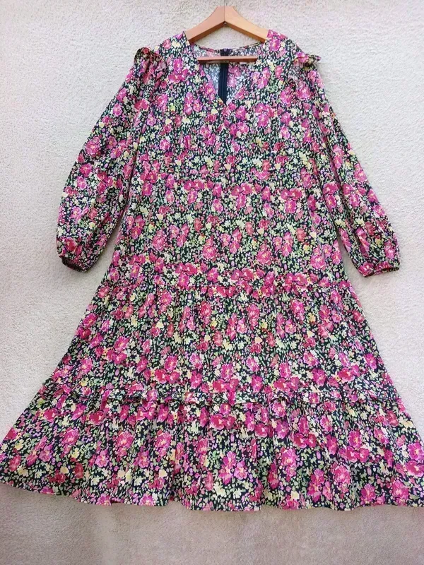 Красиве ярусне плаття у квітковий принт, з модним рукавом на гумці, на спині прихована блискавка, гладкий прохолодний поліестер, до тіла приємний, становлення ідеал НО грудей 60, НО талія 56, НО стегна 72, рукав 63, довжина 124 Заміри відмінності половина
