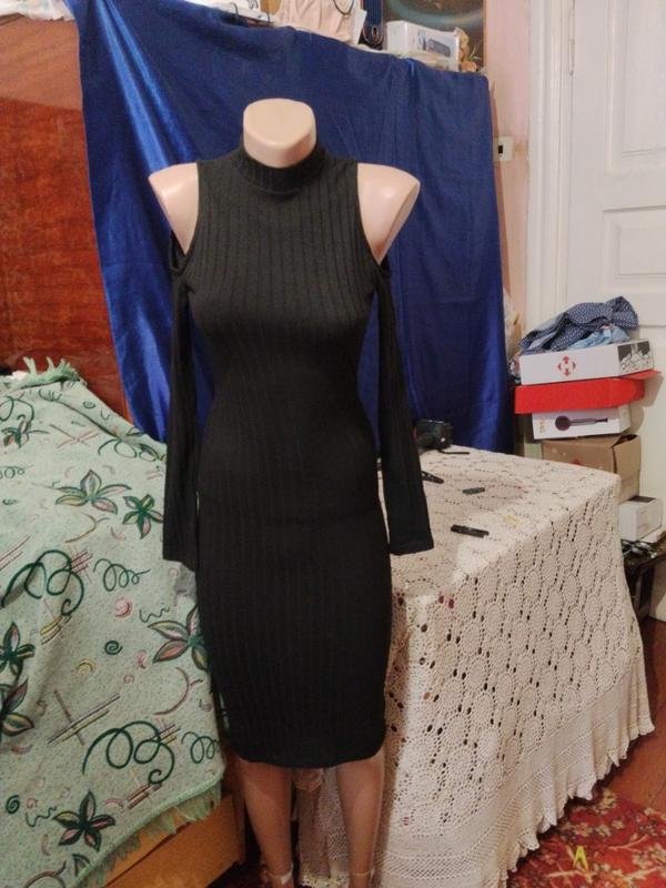 дуже гарна чорна сукня в крупний рубчик з відкритими плечами.Бірки немає,тканина приємна до тіла і тягнеться.Розмір 2хс, хс,маленька с. опис стан дуже хороший довжина 104 рукав 60 ширина груді 35 ширина бедер 39