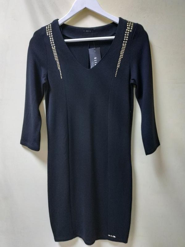 Платье Mohito черного цвета,спереди декор из металла желтого цвета,в боковом шве -потайная молния,рукав 3/4. Ткань с эластаном- растяжимость небольшая.Размер указан L (cм. замеры) ПОГ-40 см,рукав-47 см, плечо-36 см,ПОТ-38 см,длина -90 см.