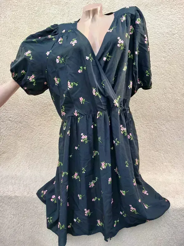Черное платье, до пояса на запах, пояс мягкая резинка,вискоза штапель, становление идеал ПО груди 62, ПО талия резинка 52-58, ПО бедра 75, длина 100 Замеры отличий половина