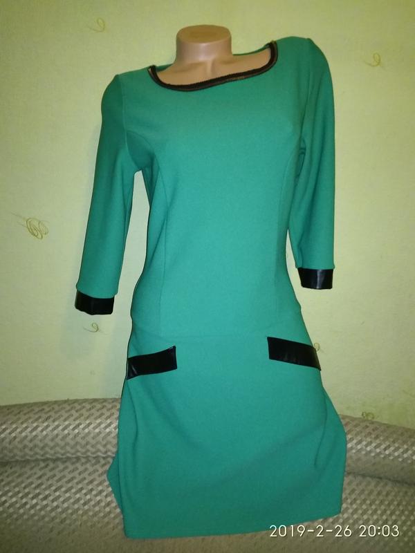 Красивейшее платьице очень красивого фасона ,декорированое штучной кожей.Рукавчик 3/4. Цвет очень красивый зелёный. Плотный мягкий трикотаж соты. Новое,одето 1 раз для фотосесии.Шикарно ложится по фигуре за щет очень удачного покроя,подчеркивает что надо и скрывает где не надо.Красивая отделка горловины не требует дополнительных украшений. Замеры: Пог 46(по спинке,по груди за щет выточек 51) Пот 39 Поб 49 Длина 92
