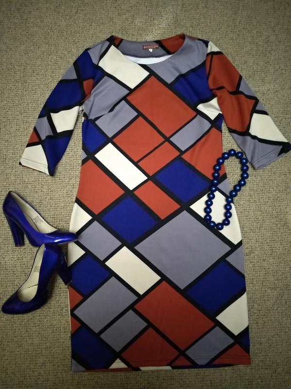 Плаття з геометричним принтом. Рукав три чверті. Кольори яскраві кращі чим на фото Тканина добре тягнеться Плаття маломірка написано 48 реально на 48 укр розмір Довжина 95 см Довжина рукава 40 см Плечі 38 см ОГ 46 см ОТ 42 см ОБ 50 см