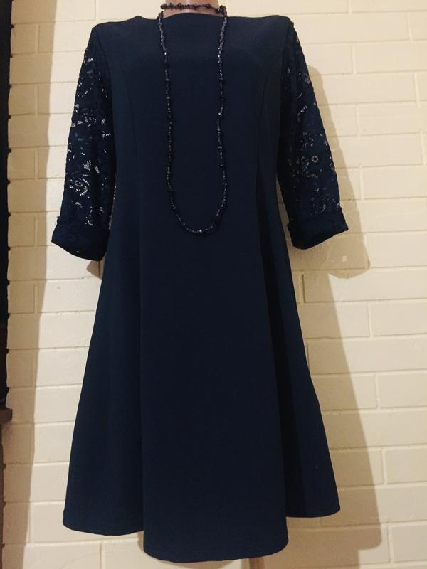 Платье с кружевными рукавами. Длина 87см. Грудь 94см. От плеча к плечу 39см.Талия ПОТ 42см. Бедра 110см. Ткань средней плотности,ткань тянется. Цвет темно -синий.