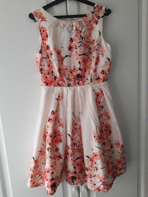 Красивое, нежно розовое платье с потрясающим принтом! Бирка срезана, состояние идеальнейшее, где-то пару раз. Качество хлопка высокое, подкладка тоже хлопок. Размер 12 или М-L. Длинна 94, ПОГ 46-47, ПОТ 38.