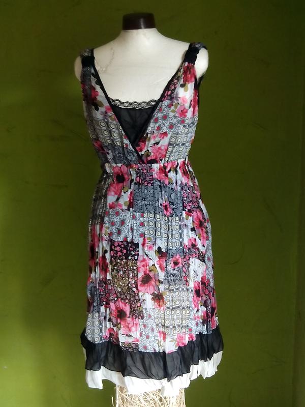 Цветное платьице. Много елементов декора. На груди Черное кружево имитация второй маечки. Внизу два вида рюш -черная и светло масляная. Платьице свободное. Пояс на резинке. Поэтому может быть хорош и на размер 38 и 40 но с хорощим размером груди.Длина 104. Есть подюбник. Не просвечивается.