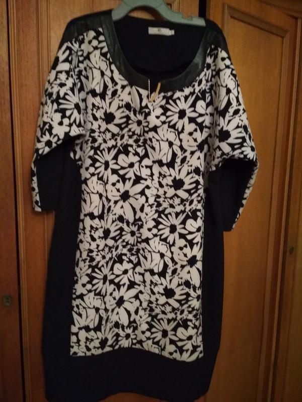 Плаття модного фасону. Колір передає фото№3. З переду вставка в білі квіти, зад однотонний.По низу плаття патент. Патент звужує низ плаття. Фігура візуально зменшується.Довжина 101, ПОГ 58, ПОБ 66, Рукав 55