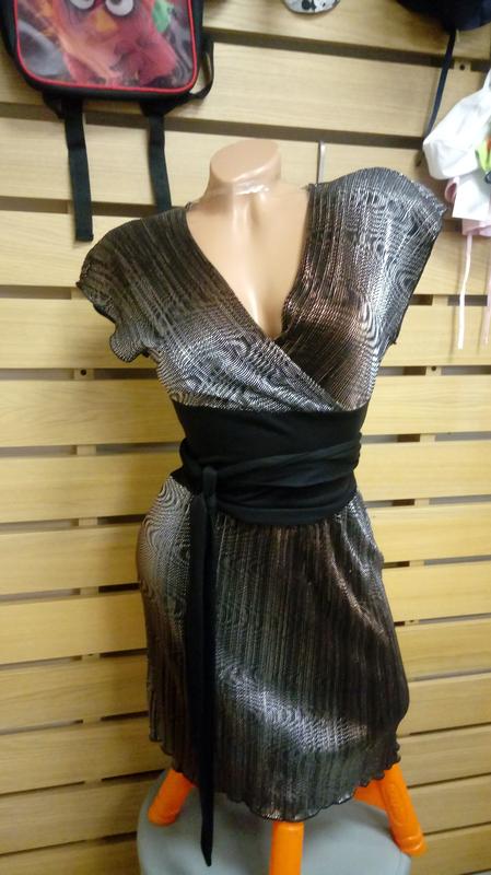 Цвет красно-серебристый, золотисто-серебристый. Нарядное платье в золотисто-серебристом цвете, черная вставка с поясом подчеркивает талию, глубокое декольте на запах. Ткань легкая, эластичная. Замеры: пог. 42см, пот. 36см (тянется), поб. 46см, длина 85см. Производитель США Milliore. Самовывоз скидка 5% Код товара 5085