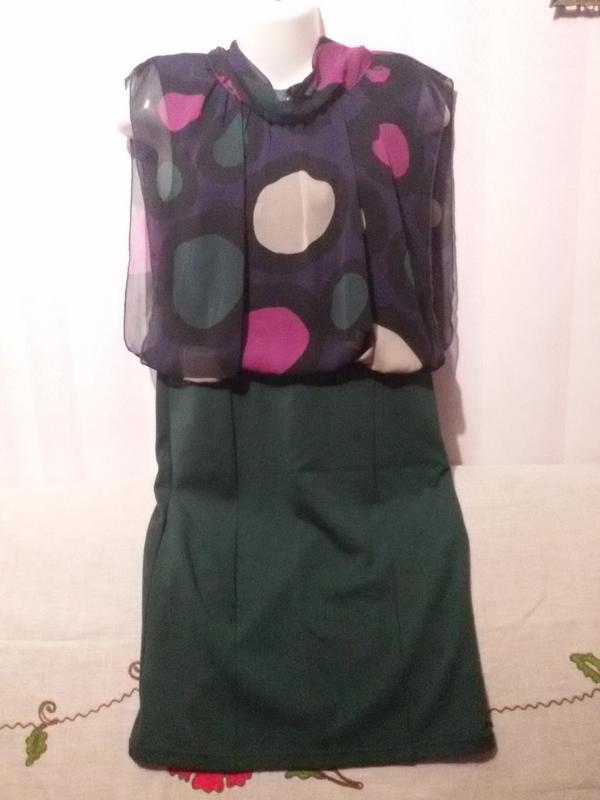 Строгое красивое платье. Верх шифон, под ним тоненькая вискозная майка. Юбка плотный стрейч трикотаж. Состояние без замечаний. Размер указан 14. Замеры : Длина 99 см Длина кофточки до талии 40 см ПОГ 47-55 см ПОТ 45 см + ПОБ 48-50 см Плечо 8 см