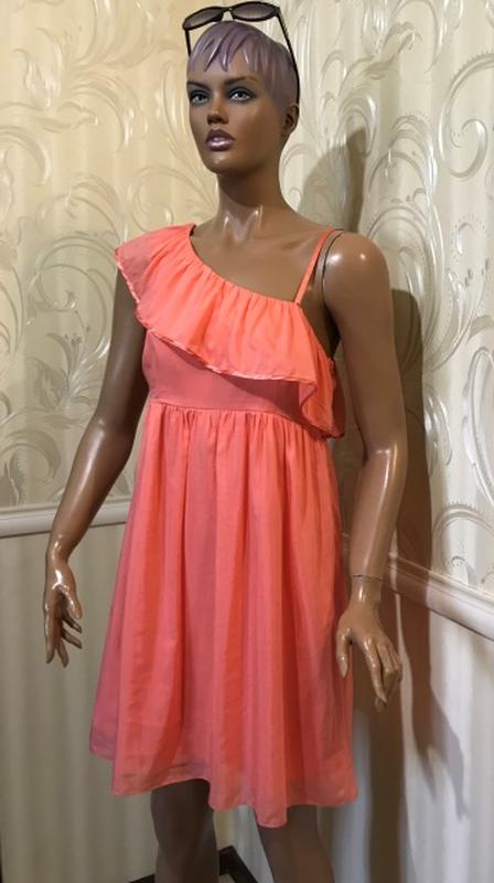 Ніжне, легке плаття/волан на одне плече і регульованою лямкою на другому плечі персикового кольору, вільного крою, з відрізний лінією грудей (в області грудей виточки), вільної спідницею, повністю на підкладці, застібається збоку на потаємну блискавку і гачок. Бренд VILA CLOTHES (Данія). Склад: виріб - 70% бавовна, 30% шовк; підкладка - 100% поліестер. Тканина тонка, легка. Розмір М. Стан ідеальний. Заміри: ПОГ по лінії выточек - 44/45 див., ПО лінії відрізу грудей - 38 див., ПОБІДИ на підкладці (верх більш розкльошений) - 51 див., довжина від плеча з воланом - 88 див., довжина верхньої частини до лінії відрізу - 33 див, довжина спідниці від лінії відрізу - 55 див., довжина по боковому шву без волана - 65 див, повна довжина регульованою лямки - 44 див. Розмір манекена S. Ласкаво просимо в наш магазин. Відомі бренди, відмінна якість - доступні ціни.