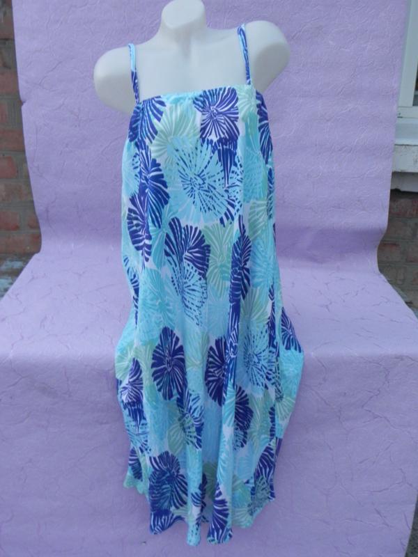Верх сарафана на резинке - это примерно будет ширина между подмышек - 33-60см, ну это на всю, но оно не должно быть в обтяжку, где то по средине до 46-48см будет нормально, от груди расширяется к низу, в бедрах уже где то до 85см, а низ уже 100см, такая летняя разлетайка