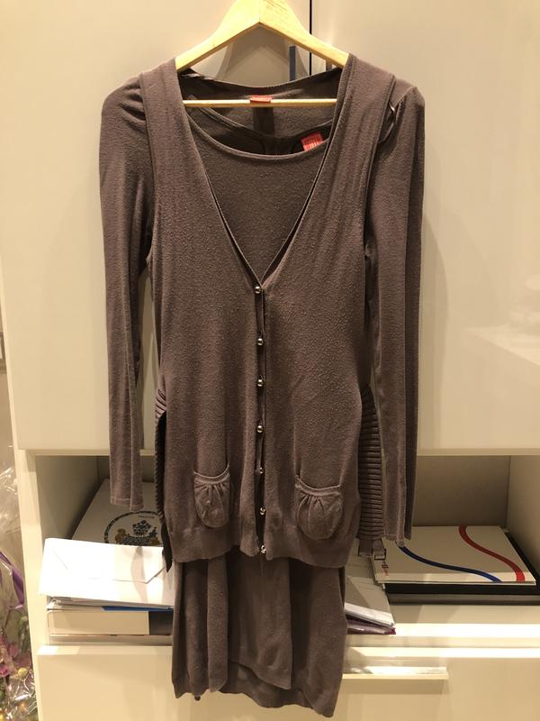 Длина платья 99 Длина жилетки 74 78% вискоза 22% нейлон Платье с длинными рукавами, жакет без рукавов. Жакет на пуговицах и с поясом на спине Маленькие кармашки на жакете, платье без карманов