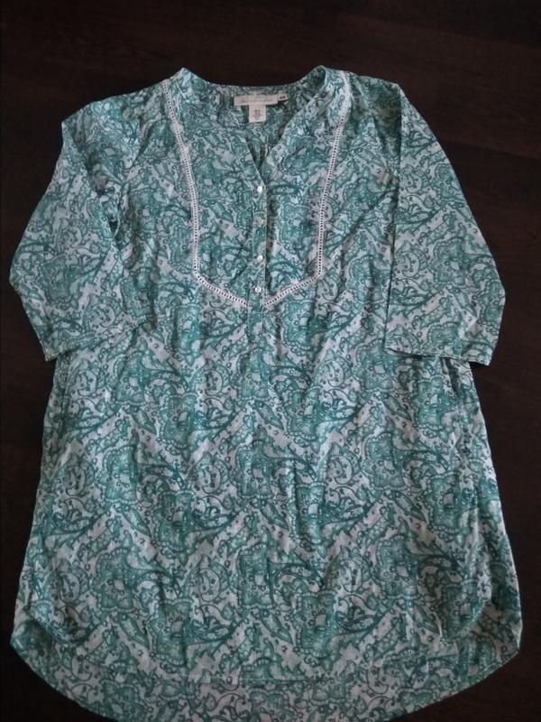 Лёгкое летние ХБ платье С двумя карманами по бокам Рукава 3 /4 Спереди короче сзади чуть длиннее Свободного кроя Длина спереди - 83см Сзади - 89 см Ширина от подмышки к подмышки - 53см Рукава - 43см Плечи - 39см Бёдра - 55см