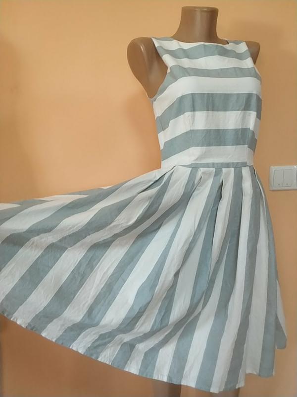 хлопковое платье в стильную полоску на подкладке (хлопок) британского бренда dolly and dotty. цвет: серо-голубая полоска с белой пог - 40-41см пот - 34см длина - 98см длина "юбки" - 58см