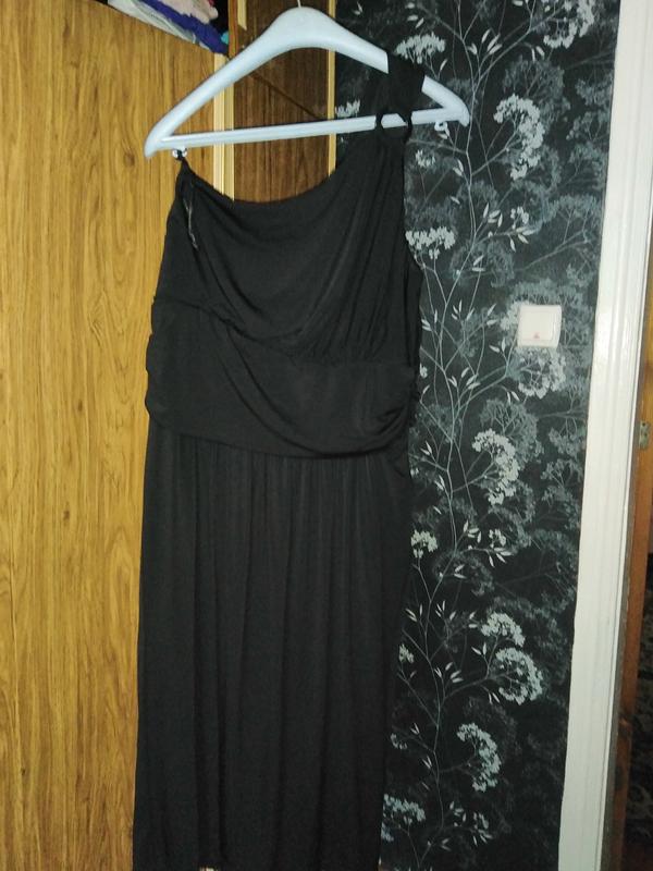 замечательное платье на одно плечо,изумительное качество,глубокий черный цвет,есть подкладка,змейка,тянется,длина-110см,талия-41см,пог-45см, поб-52см,размер 18