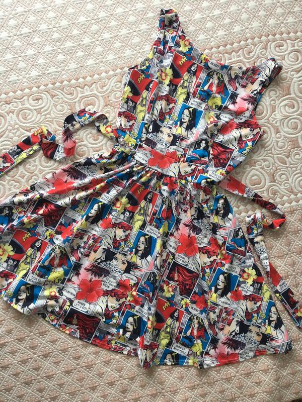 Класна сукня з цікавим принтом в дуже гарному стані, плотна тканина: (90% нейлон, 10% еластан) добре тримае форму, розмір 12(приблизно на М/L, дивіться заміри на фото).