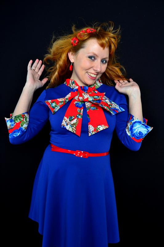 отличного качества яркое, интересное платье электрик с цветными манжетами и воротником-бантом. есть белый поясок к нему