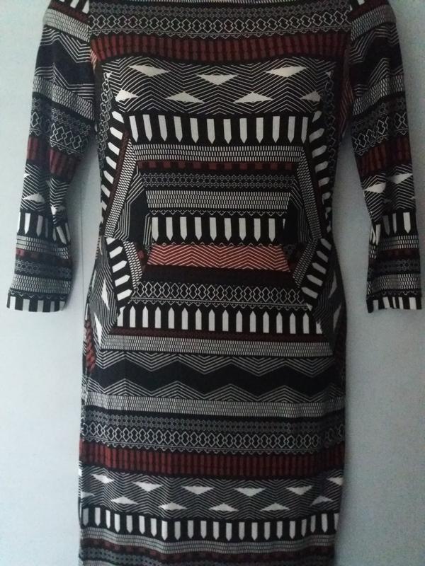 Модель відрізняється приталеним фасоном, помірною довжиною. Стильний, оригінальний та ультрамодний геометричний принт – справжня родзинка цієї сукні, одягнувши котру, ви точно не залишитеся не поміченою. Довжина - 102см. Рукав - 51см. Плечі - 40см. Талія - 44 см. Тягнеться. Низ - 49см.