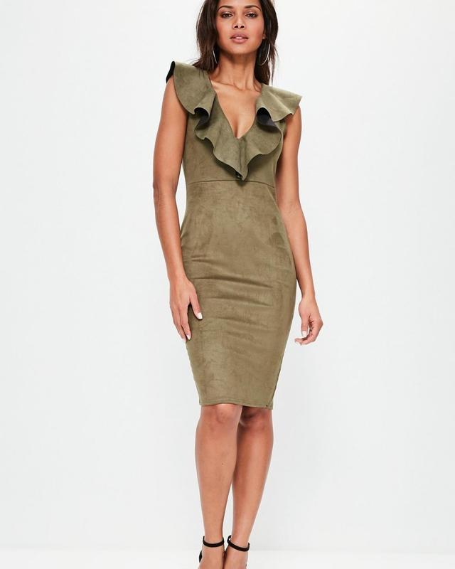 ❤️шикарное плотное платье под замш миди, глубокий вырез с воланом, тянется ☑️ Размер- 12 Пог 45+, пот 40+, поб 46+, длина 100 ☑️ Бренд- missguided ☑️ Состояние- идеальное Фото на теле не делаю!!!