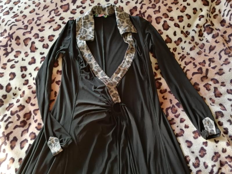 Чёрное платье на запах, с декольте, с леопардовыми вставками и воротником. Состав 10% лайкра, 80% модал (полусинтетическое вискозное волокно), 10% супрем. 📏Пог 43 см, пот 38 см, рукав 62 см, плечи по спинке 35 см, длина по спинке 100 см. Замеры в спокойном состоянии, материал хорошо тянется.