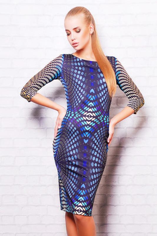 Оригинальное платье Платье Мираж Новое! Цена ниже оптовой на сайте! Стильное женское платье из дайвинга с оригинальным принтом. Обладает приталенным фасоном с зауженным книзу подолом. Длина модели средняя, до колен. Рукав прямой, длиной три четверти. Горловина открытая, продолговатой овальной формы. Главной изюминкой наряда является объемный принт с оптическим эффектом. Эффектные переходы геометрических форм в сочетании с градиентной окраской голубовато-синих тонов создают удивительно магнетический образ. Отлично подходит для клубной вечеринки. В таком наряде вы непременно окажетесь в центре всеобщего внимания! Длина изделия: 96 см, длинна рукава 43 см. Для всех размеров. Рост модели на фото - 174 см. Размер С (42-44)