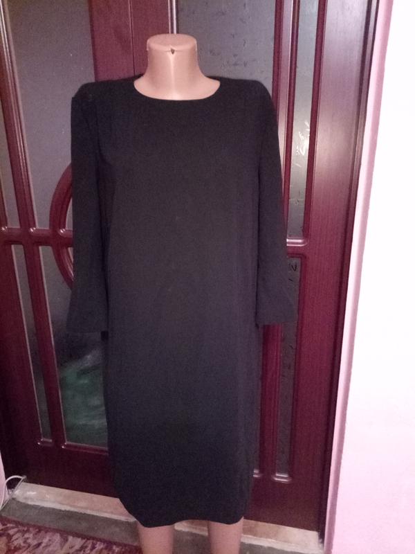 Строгое платье черного цвета, на подкладе, круглый вырез горловины, рукава 3/4, слегка расширенные, застегивается сзади на потайную молнию с фирменной надписью, длина миди. ПОГ 54см, ПОТ 55см, ПОБ 57см, плечо 12см, рукава 47см, между плечами по спинке 43см, длина 95см.