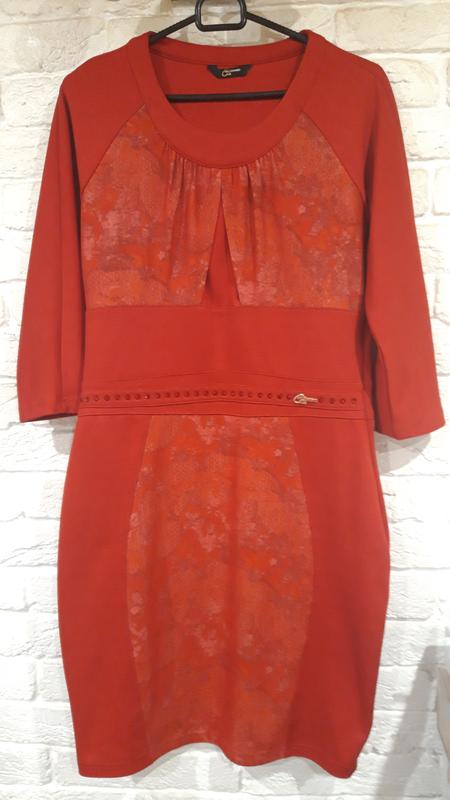 Платье необычного кроя с вставками из ткани компаньона. Украшено красными камешками и логотипом фирмы.