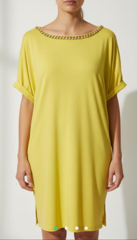 Красивое платье свободного кроя с рукавом "летучая мышь". И декоративной цепью на кромке горловины.Размер универсальный садится замечательно от 44 до 50 .Просто объем будет смотреться по разному. Ткань трикотаж.