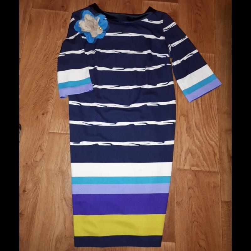 Дуже красива сукня напівприлеглого крою – на спинці є виточки по талії, попереду немає, приховує невеликий животик, якщо є. Покрій на кшталт "кокона", до низу злегка звужено. Рукави 3/4, вільні. Свіже поєднання кольорів, сукня привертає до себе увагу. Комір хомутиком, ззаду красиво відкриває шию. Розмір 52 можна на 50. Квітка передбачена виробником, я її зняла, тому що використовувала як прикрасу зачіски з цією сукнею. Виходило трохи в японському стилі. Квітку докладу до сукні, раптом вам захочеться повернути її на місце.
