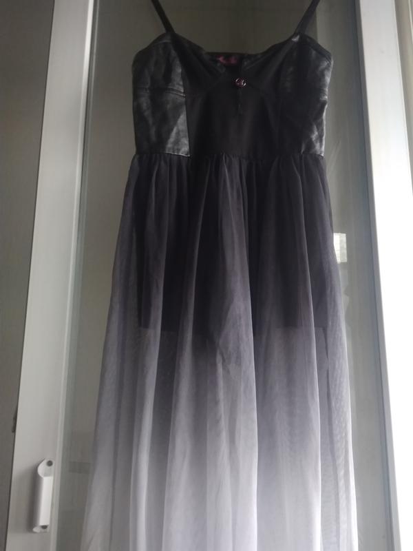 Новое очень красивое платье - ромпер На тонких бретелях, регулируются Вставки из кожзам Смотрится как КОЖА Застёгивается с боку на английском замке Юбка сетка, плавно переходящая из светло-серого в тёмный серый цвет Длина - 110см Полуобхват - 40см Пояс - 34см Бёдра в шортах - 41см Ткань хорошо тянется Снимала замеры, ткань не натягивала