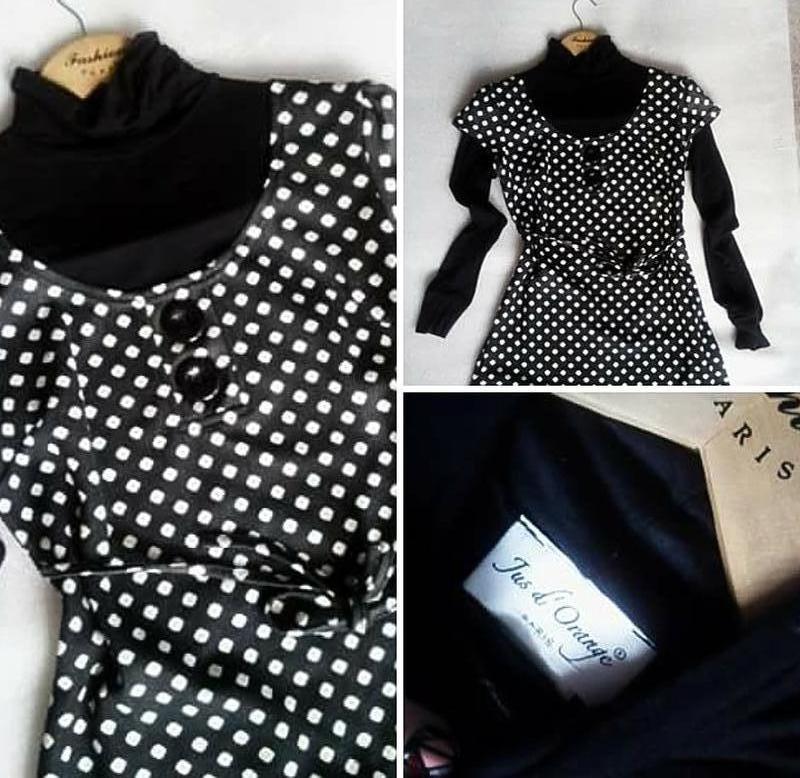 Чудесное платье,французкий бренд,черное в горошек,длина 85см,снизу как будто гольфом,который пришит к верху,очень мило смотрится с пояском,который при нем. Размер S