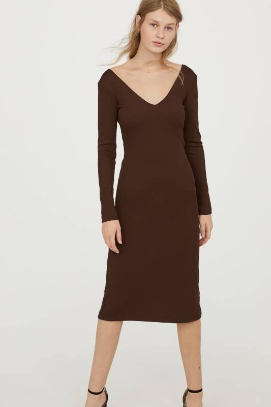 Стильное платье шоколадного цвета, в рубчик, с вырезом спереди и сзади, рукав 3/4, ткань плотная Пог 40 Пот 32/50 Поб 42 тоже хорошо тянется Длинна 114