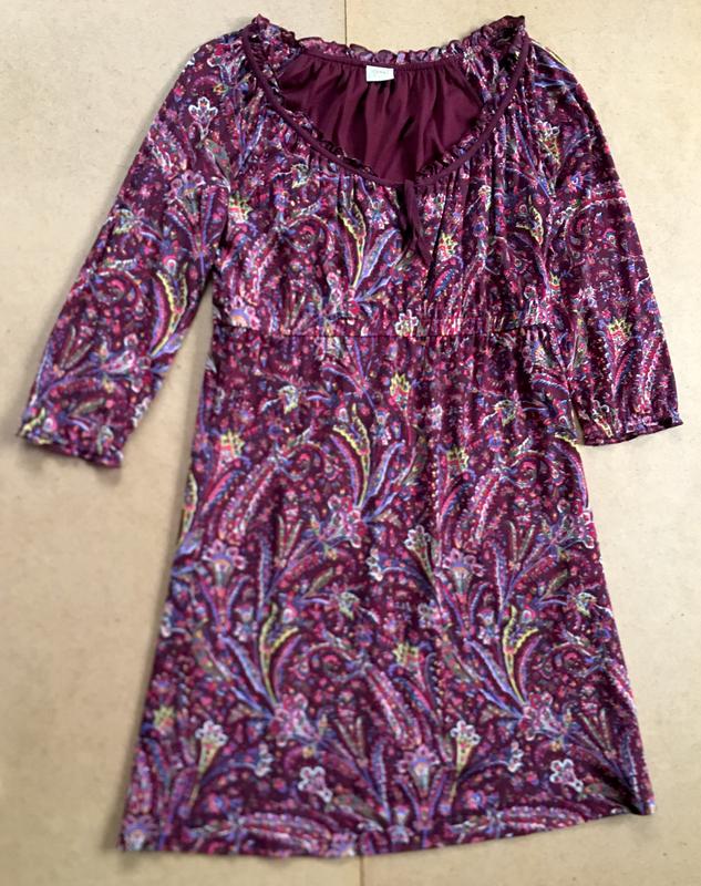 Платье из полиестра стрейч, на подкладке. С завышенной талией, на груди присборено, по вырезу оборочка. Замеры: ПОГ 46см (за счет сборок подойдет на 50), ПОТ 41 (вшита резинка, тянется до 44), ПОБ 53см, длина 93см, длина рукава от горловины (реглан) 53см.