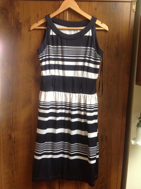 Сукня трикотаж не мнеться. Тягеться і добре лягати. Темно синього кольору з білими смужками.