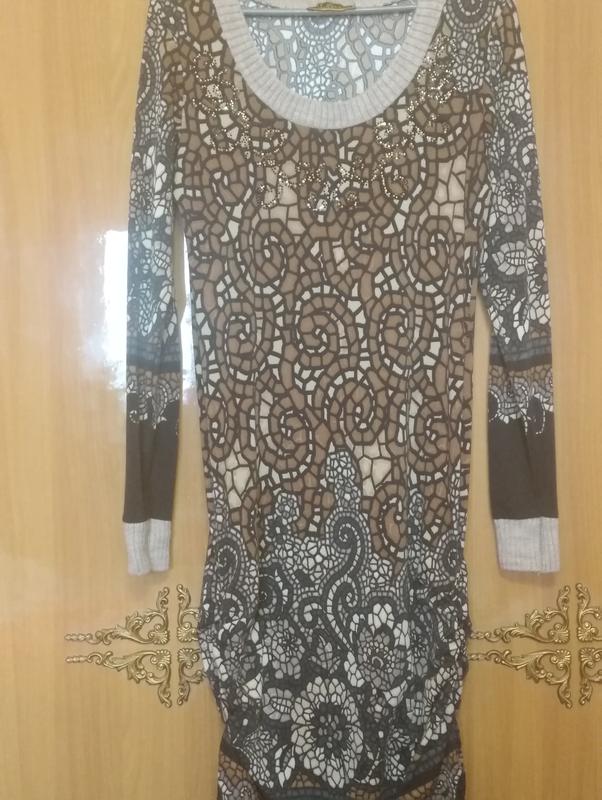 Красивейшее платье в принт, вязанные манжеты и горловина, украшенное россыпью стразов. По бокам на затяжках, что дает возможность регулировать длинну. Ткань хорошо тянется, платье идеально садится по фигуре. Идеальный вариант для выхода в свет и для повседневной носки. Состояние новое, не носилось, бирка срезана. Производство Турция. Состав ткани: вискоза 90 %, эластан 10%.