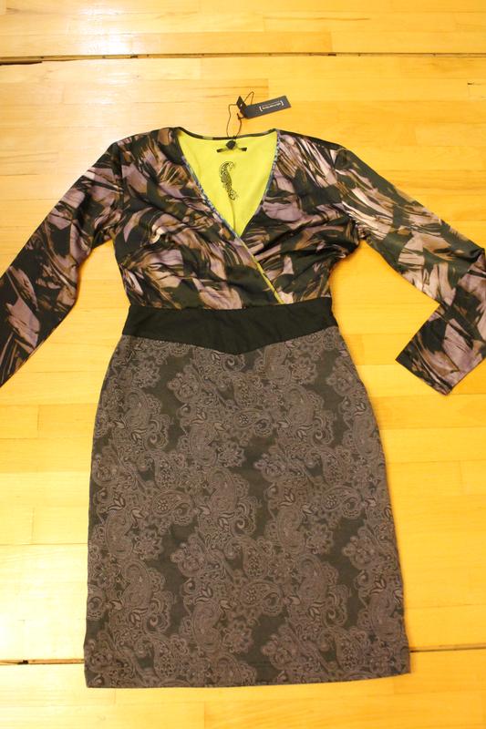 Класне плаття зі стрейчевої тканини, верх двойний і низ теж має підкладку.Розмір 38 вказано.Довжина-100см, плечі-43см, рукав від плеча-61см, пог-50см, пот-37см, поб-50см . Плаття має замочок і кишені по боках.