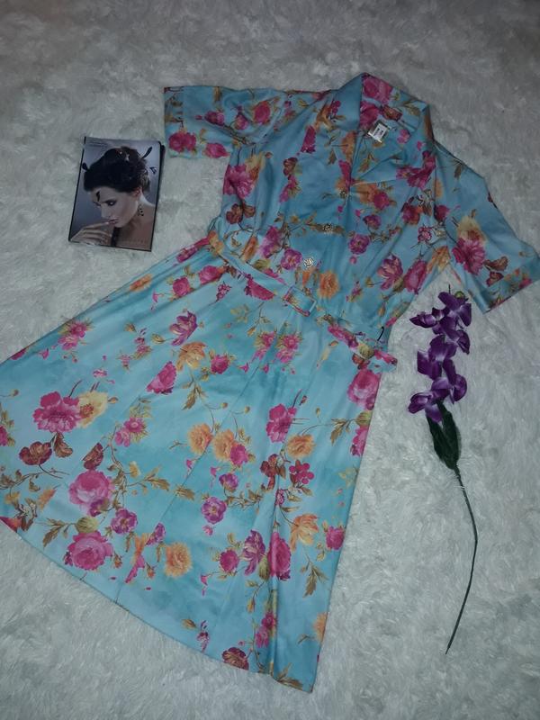 довжина сукні 105 см, ог 100 см, от 90-98 см, об вільно 120 см., поясок твердий, спереді до половини на ґудзиках, розмір вказано 12. тканина досить плотна, підкладки немає.