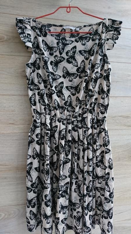 Красивенькое платьице фирменное New look новое, без бумажной бирки. Размер указан UK 10 EU 38 На наш размер М. Цвет - беж с принтом бабочки, яркая летняя расцветка. Состав:100% полиэстер. Производитель - Индия. Замерчики : - длина от плеча до низа 87см - полуобхват груди 45см -талия на резинке в нерастянутом виде полуобхват талии 31см, тянется до 45см