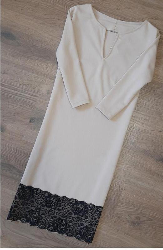 Элегантное бежевое платье, внизу - черное кружево. Рукав три четверти. Прямое. Размер 42. Обратите внимание на замеры: длина - 86 см., рукав - 39 см., ширина - 37 см.Смотрится очень классно! Отличное состояние! Могу выслать дополнительные фото.