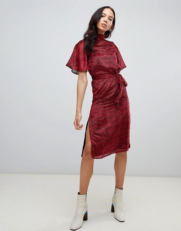 Glamorous плаття міді бордо червоне з чорним в 3-д горошок з розрізами для вагітних № 117