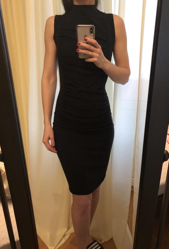 Трикотажное платье чёрного цвет, тянется, размер s. Спереди идет присобранная вставка. В носке было два раза. Линия от подмышки до подмышки - 36см; Линия талии - 32см; Линия бёдер - 39см; Длина по спине - 97см. Состав: 70% коттон, 30% шелк. На фото на фигуре: рост 165, ОГ 84, ОТ 64, ОБ 94. Подойдёт и на параметры меньше.