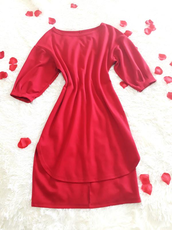 Нарядное красное платье, размер 44-46 Свободного кроя с четвертным рукавом, спереди идёт короче, сзади длиннее. Длина платья спереди 88 см. сзади 98 см. Длина рукава от плеча 32 см. от воротника 48. ПОГ 47 см. ПОТ 42 см. ПОБ 49 см.