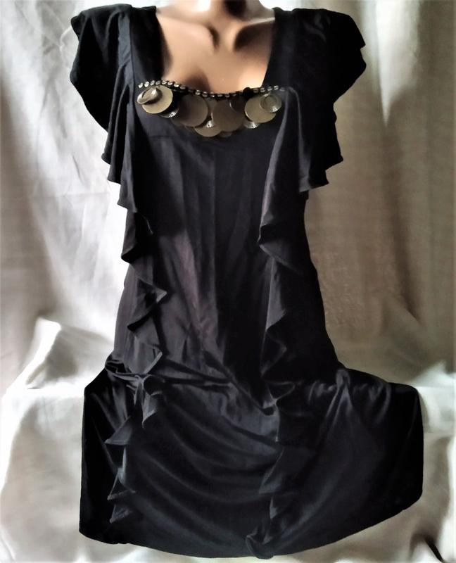 Натуральна,стильна. Облягаюча по фігурі, з вертикальними воланами. Оздоблена "монетками" . Нова,без паперової бірки. Всі виміри зроблені в спокійному (не розтягнутому) стані. Довжина(по спині) 81 Завширшки(пахви) 45