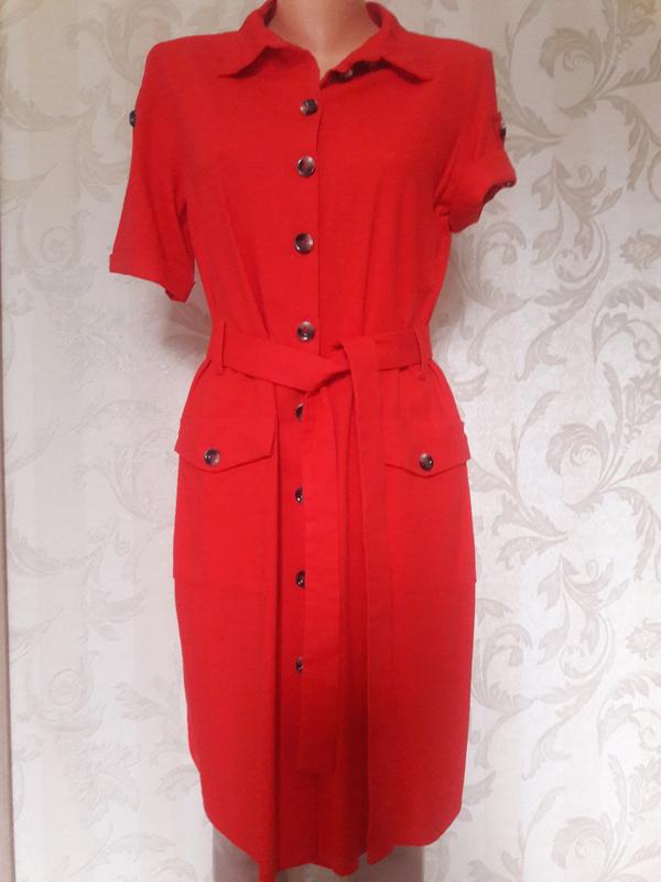 Легкое, натуральное платье рубашечного кроя под пояс. Платье по всей длине на пуговицах. Размер 46-48. Стан идеален. Было одето один раз. Длина изделия по спинке от горловины 89см. Из груди от подмышки до подмышки-50см