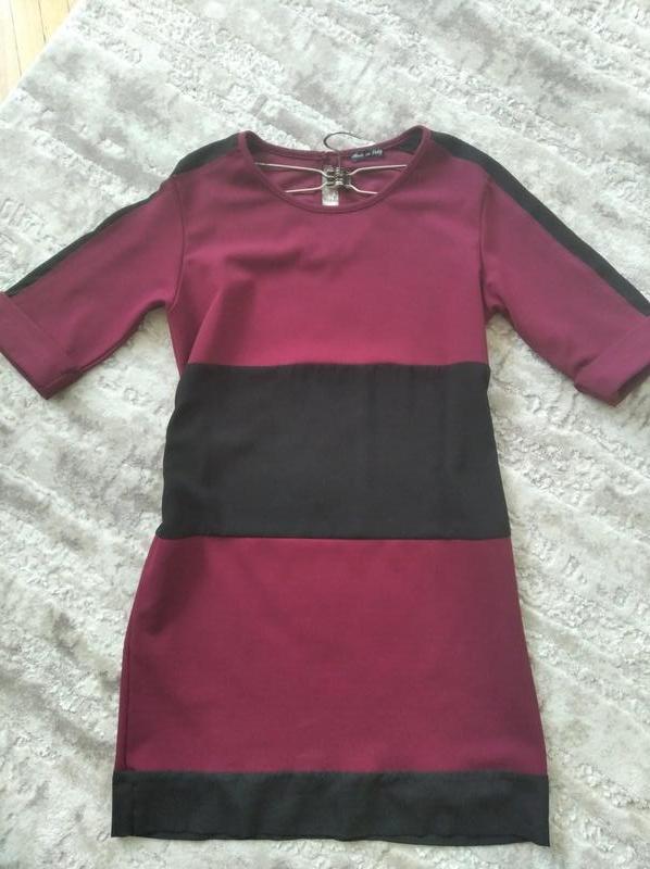 Плаття поєднує дві тканини: фіолетова — поліестр+віскоз, а чорна —шифон. Чорний шифон вільний на талії, зарахунок чого скриваються недоліки. Розмір універсал: від l до xl