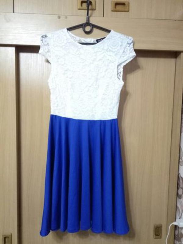 Нарядное ажурное платье сине белого цвета, стрейч, состояние идеальное, верх на подкладке белый жемчужный ажур, низ юбка сонцеклёшь спадающая ткань, широкий синий пояс, смотриться супер Размер точнее смотрите по замерам платью ПОГ 41см ПОТ 34см ПОБ свободный крой Рукав 9см Длина изделия 87см Плечи 34см Смотрите другие мои обьявления, подписывайтесь на обновления Отправлю как Вам удобно